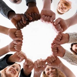 groupe de personne. formant un cercle avec leur point tendu pour illustrer l'engagement de la maison du bien-etre de Margency.